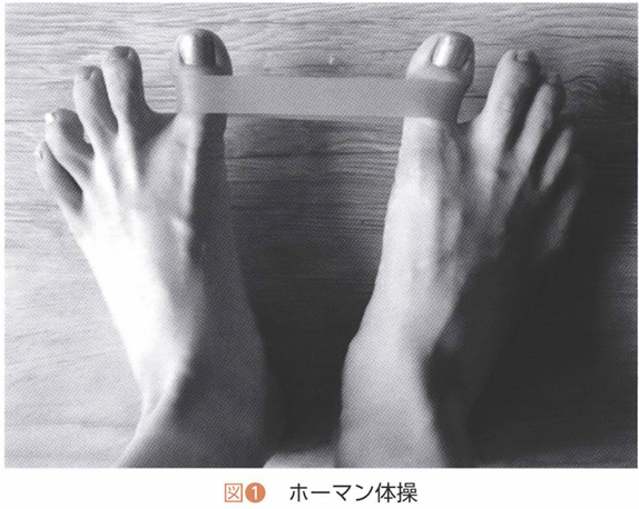 運動療法には母趾の拘縮改善を目的としたストレッチ体操と,母趾外転筋の筋力強化を目的とした筋力増強訓練があります。ストレッチ体操としては,両側母趾に幅広のゴムをかけて,踵を合わせたまま両足のつま先を開いて5~10秒間をキープする,いわゆるホーマン体操を行います。.