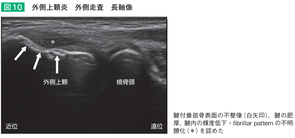 診察では肘のスジの付着部を軽く押したり、手首を反らして肘の痛みが生じるかを確認します。またレントゲンで肘の変形がないかを確認し、エコーでスジが腫れてたり痛んでいたら(下の図)、診断が確定します。