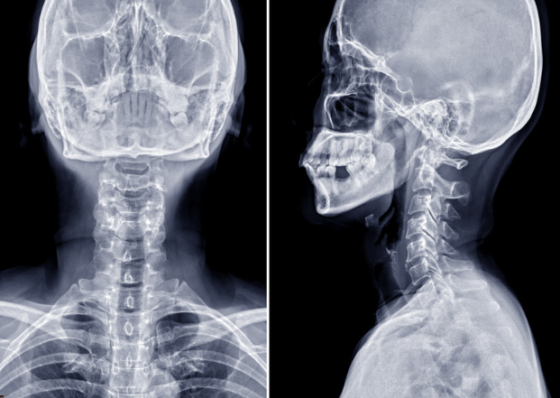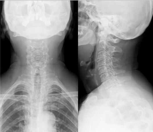 まずレントゲンを撮像し、正面と側面、顎を引いた状態、顎を上げた状態での頸椎の骨の並びや動揺があるかを評価し診断を行います。首の痛みが悪化しない範囲で撮影しますので、ご安心ください。