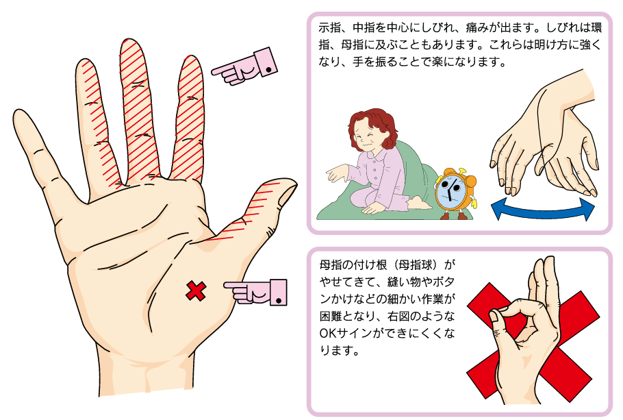 手首の真ん中に正中神経という神経が走っており、その正中神経の通り道が狭くなると、親指から人差し指、中指、薬指の一部にしびれ痛みをきたします。これを手根管症候群と言います。明け方に強くなり、手を振ることで楽になります。親指の付け根が瘦せてきて、縫物やボタンかけなどの細かな作業がやりにくくなり、図のようなOKサインができなくなります。