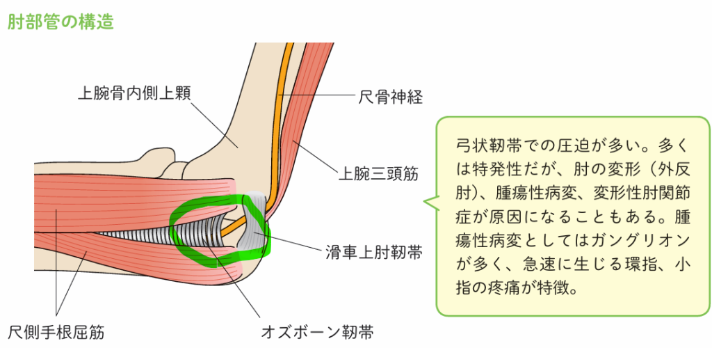 肘の内側に尺骨神経という神経が通っています。肘の内側をデコピンすると、肘や指までビーンっとしびれるため、肘の内側はfanny boneなどと言われいます。その尺骨神経の通り道が狭くなり、腕の内側や小指のしびれを起こす病気を肘部管症候群と言います。下の図の緑の部分で狭くなります。