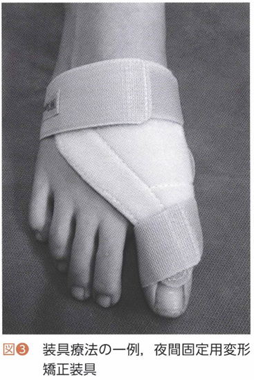 保存治療でまず行うことは靴選びの提案です。外反母趾は変形そのもので痛いことはほとんどなく,靴との干渉が主な痛みの理由です。靴選びの指導は,具体的にはトゥボックスが広いもの,靴の先端が母趾寄りのもの,母趾の骨突出部に縫い目がなく,かつ同部の素材が柔らかいあるいはストレッチ可能な素材であるものを選びます。ただ単にサイズが大きい靴を選択している患者には,靴の中での前後の遊びによってむしろ趾がトゥボックス内に詰まってしまうので逆効果であること,また靴紐を適度に締めることも重要です。