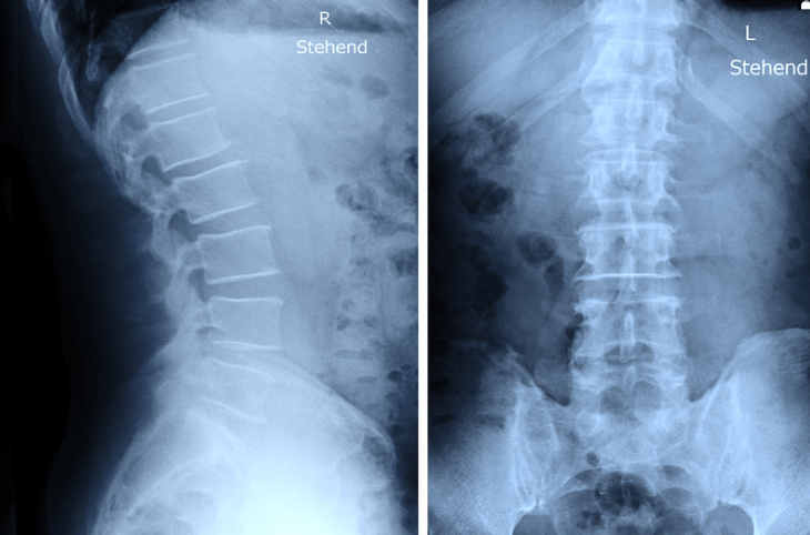診断はレントゲンで行います。正面と側面を確認し、つぶれている腰骨がないかチェックします。腰骨がつぶれてなくても安心はできず、不顕性骨折と言ってレントゲンでわからない骨折もあるので、痛みが強い場合はMRIで診断することもあります。