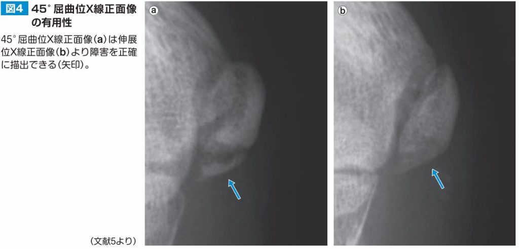 X線像での修復には1年以上を要することが多く,競技復帰後も2〜3カ月ごとに定期的な確認が必要です。X線像上での修復過程は,初期の場合,内側上顆下端にみられた透亮像の中に新生骨が出現します。新生骨と母床はともに肥大しながら徐々に骨性癒合する傾向がみられます。進行期では分節部が母床部とともに肥大を伴い骨性癒合します。修復例では,肥大や骨棘様の変化を伴うことが多いです。非修復例では,母床,分節部ともに肥大しながら癒合不全となり,最終的に遊離骨片を形成します。手術加療は,疼痛を有し保存療法に反応しない遊離骨片が適応となり,摘出術とともに靱帯修復術や再建術が適応されます。