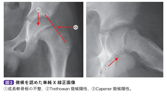 単純X線正面像で骨端線が不鮮明にみえます。すべりが進行すると骨端が内側に位置するTrethowan(トレソーワン)徴候、側面像では骨端核後方部分が寛骨臼の外にはみ出すCapener(ケイプナー)徴候を認めます。