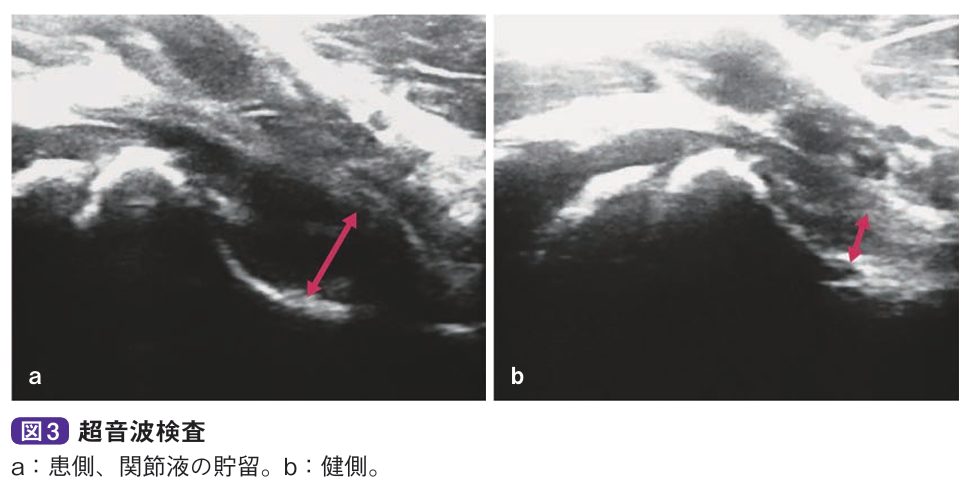 診察とレントゲン、エコーなどで診断します。関節可動域は軽~中等度と制限され、とくに屈曲位で内旋が制限されます。微熱を認めることがありますが、通常、血液所見は正常値を示します。単純X線像では関節液の貯留により関節包陰影の膨隆、関節裂れつ隙げきの開大、骨頭の外方化などを認めますが、骨陰影に異常を認めません。超音波検査やMRI検査で関節液貯留が明らかとなります。