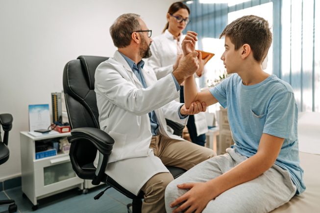 身体所見で肘の後方の圧痛やストレステストでの痛みの誘発を確認します。またレントゲンやCT、MRIで肘頭の成長線の開きや疲労骨折などの有無を確認します。